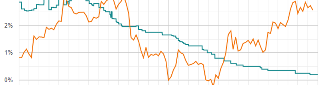De oranje lijn is die van de inflatie in Nederland. Als de spaarrente de inflatie goedmaakt ligt de oranje lijn onder de blauwe. En dat is dus al sinds 2017 andersom.... De waardevermindering van ons geld is ruim hoger dan de spaarrente. Niet een beetje... terwijl de inflatie richting de 3% gaat staat de spaarrente bijna op nul. Overigens zal de inflatie in 2020 wel weer lager zijn - vorig jaar werd die sterk opgevoerd doordat we meer btw zijn gaan betalen vanaf 1 januari 2019.